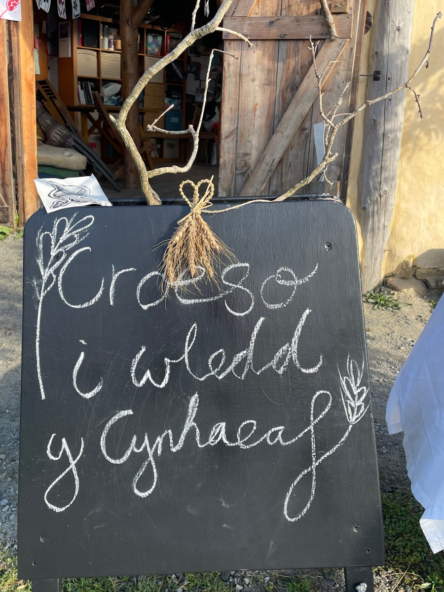Bu’n rhaid gohirio’r wledd olaf oherwydd y tywydd ond fe’i cynhaliwyd yn llwyddiannus ddydd Gwener 17 Hydref mewn heulwen ogoneddus. Gwnaethon ni sudd o’n afalau gyda offer torri a gwasgu â llaw.  Daeth Carrie o Amgueddfa Ceredigion ag arteffactau o’u casgliad gan gynnwys stampiau menyn a chofroddion cynhaeaf. Gwnaeth Owen Shires ein diddanni gyda chaneuon traddodiadol a straeon am ei brofiad personol gyda grawn treftadaeth. Roedd yn ddiweddglo cynnes i brosiect hardd a ddaeth â sgiliau newydd a phobl newydd o bob oed i’r Ardd Goedwig – mae rhai hyd yn oed wedi bod yn ôl ar ein dyddiau gwirfoddoli arferol.