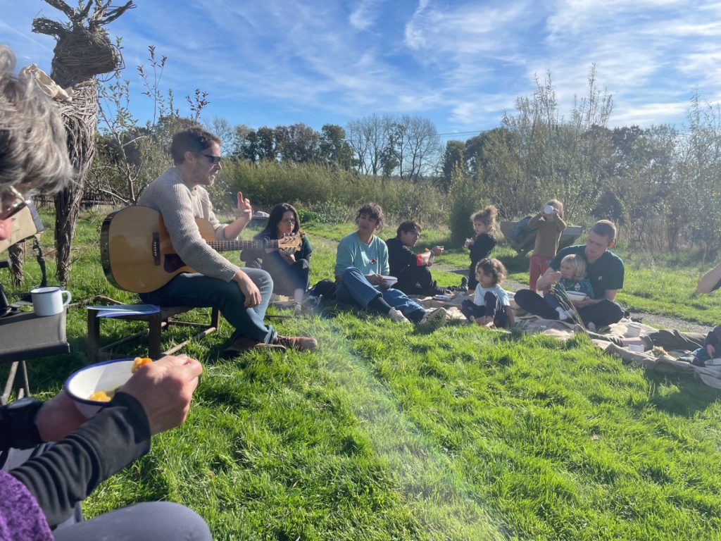 The final feast had to be postponed due to the weather but was held successfully on Friday 17th October in glorious sunshine.  Juice was made from our apples using a manual scratter and press.  Carrie from Ceredigion Museum brought artefacts from their collection including butter stamps and harvest tokens.  Owen Shires entertained us with traditional songs and stories about his personal experience with heritage grains. It was a heart warming end to a beautiful project which brought new skills and new people of all ages to the Forest Garden – some have even been back on our normal volunteer days.
