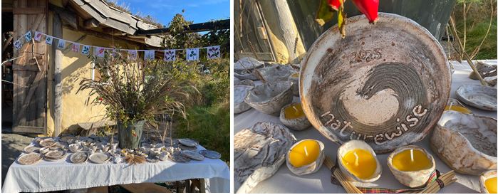 Daethpwyd ag artistiaid gwadd i mewn i gynnal y sesiynau crefft. Casglodd Kristina glai o’n pwll mawr ar gyfer gwneud ffigurau bach a daeth â chlai masnachol ar gyfer eitemau i’w gwydro a’u tanio. Gwnaed ac addurnwyd platiau, powlenni a chanhwyllau bach, yn aml yn cynnwys delwedd y gwenith. Gallai’r cyfranogwyr fynd â’r rhain adref ar ôl y wledd ddathlu olaf.