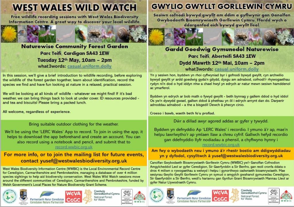 - 12 May – West Wales Biodiversity Wildlife Recording Workshop